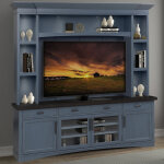 Surround your television and components in classic style with this 92-inch TV Console with Hutch and back panel. Simple yet elegant, its classic silhouette is finished in a Denim blue with a contrasting Sable wood finish. Part of the Americana Modern collection, this multifunctional media solution features adjustable wood shelves, storage drawers and compartments, 3-way LED touch-lighting, glass doors with wood trim, and cord management.