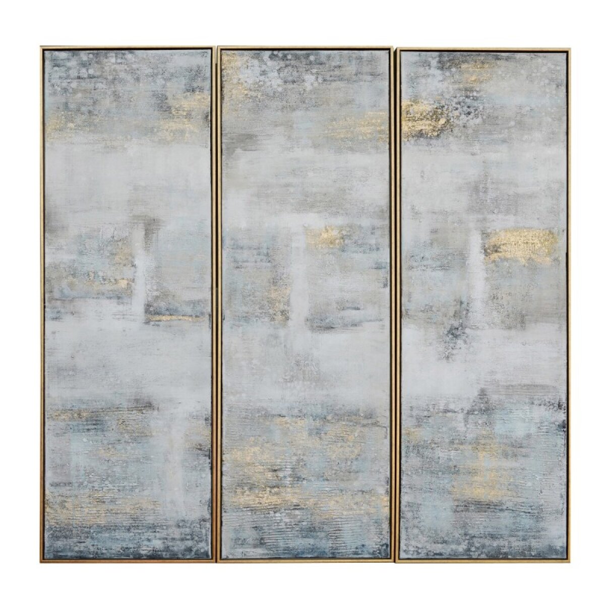The Crestview Collection Avery framed painting on stretched canvas features a set of three works of art and offers tones of grey, black and gold. This distinguished artwork measures 20-inches x 60-inches, and will integrate perfectly with almost any moder