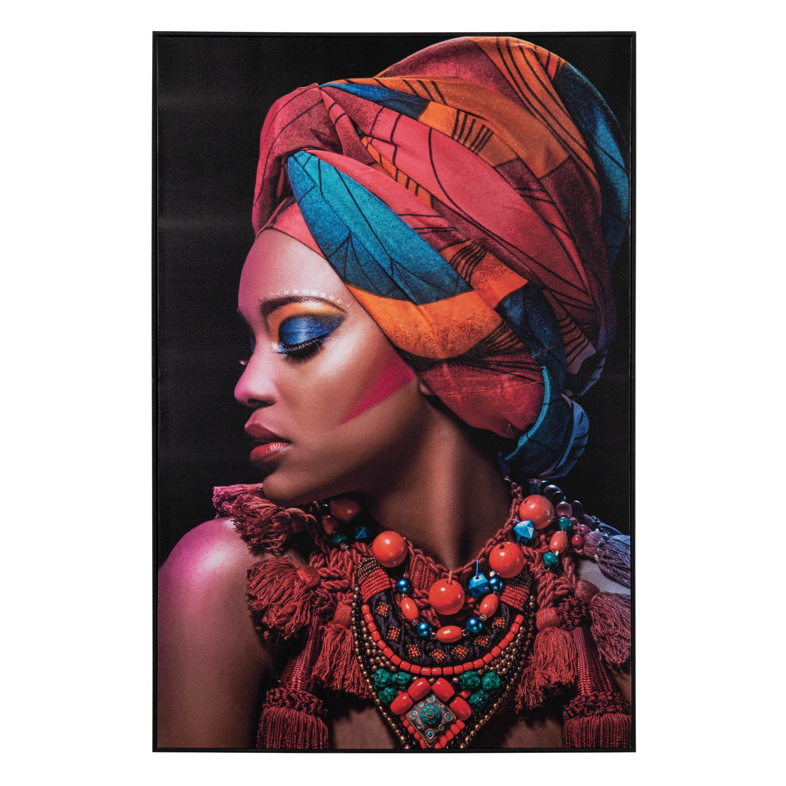 The Crestview Collection Kenna Print on Canvas captures your attention with a beautiful black woman dressed in tribal wear, bursting in bright orange, blue and red designs. The color complements her bronze skin that has been highlighted with these colors