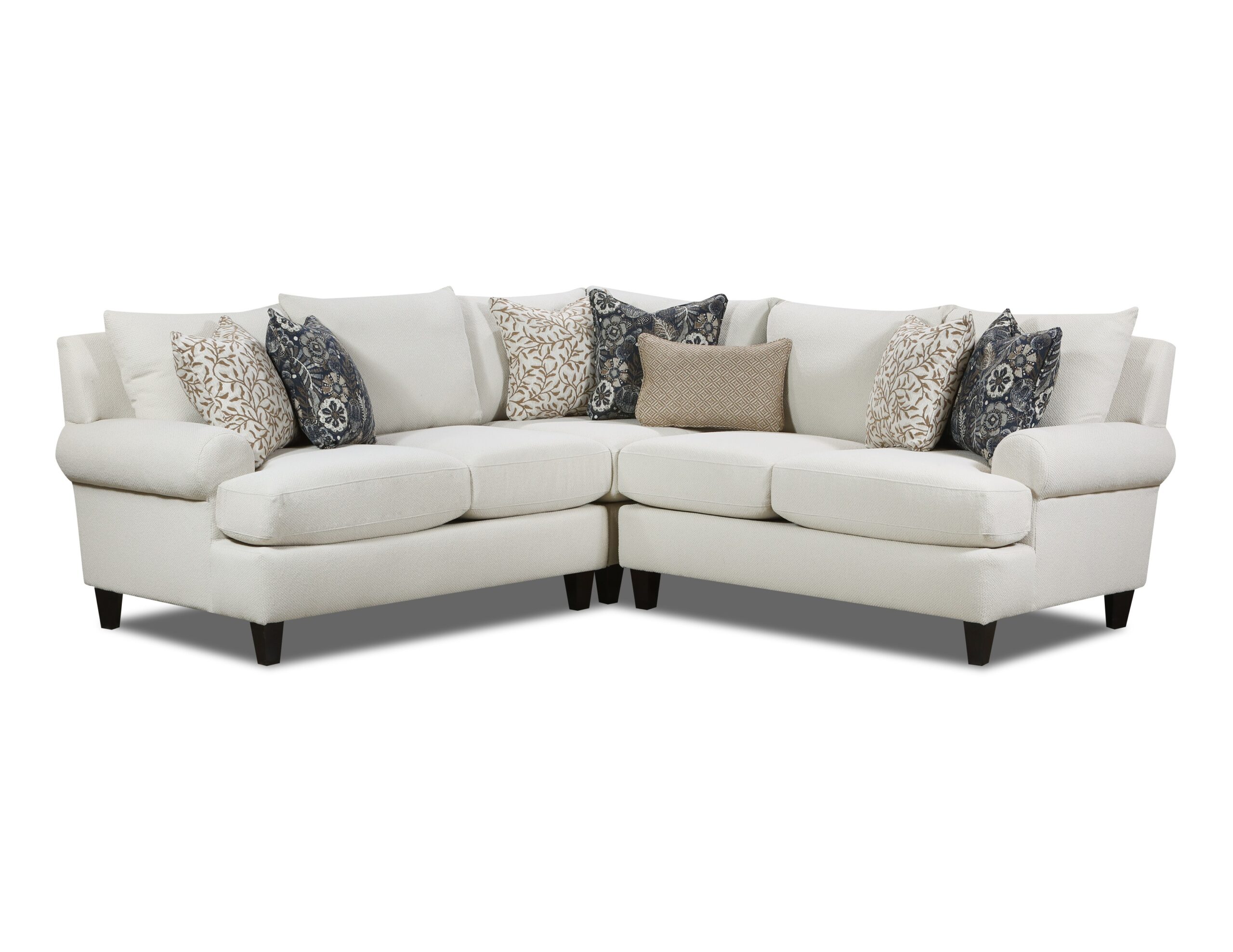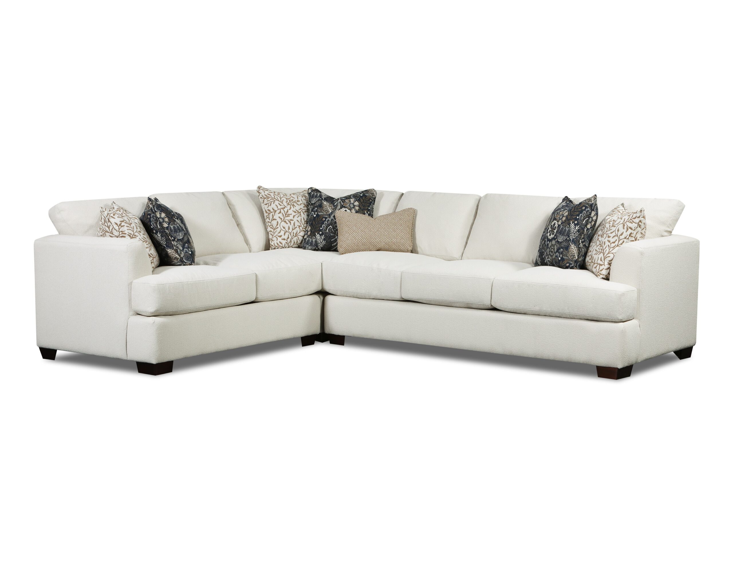 This collection showcases a clean, creamy neutral fabric with a subtle, textured weave for added elegance. The cushion arrangement features an inviting mix of earthy tones, combining botanical prints, geometric patterns, and deep navy floral designs. These accent pillows introduce visual interest and contrast, enhancing the warmth and sophistication of the overall look. The fabric combination exudes a refined, nature-inspired aesthetic perfect for transitional or classic interiors.