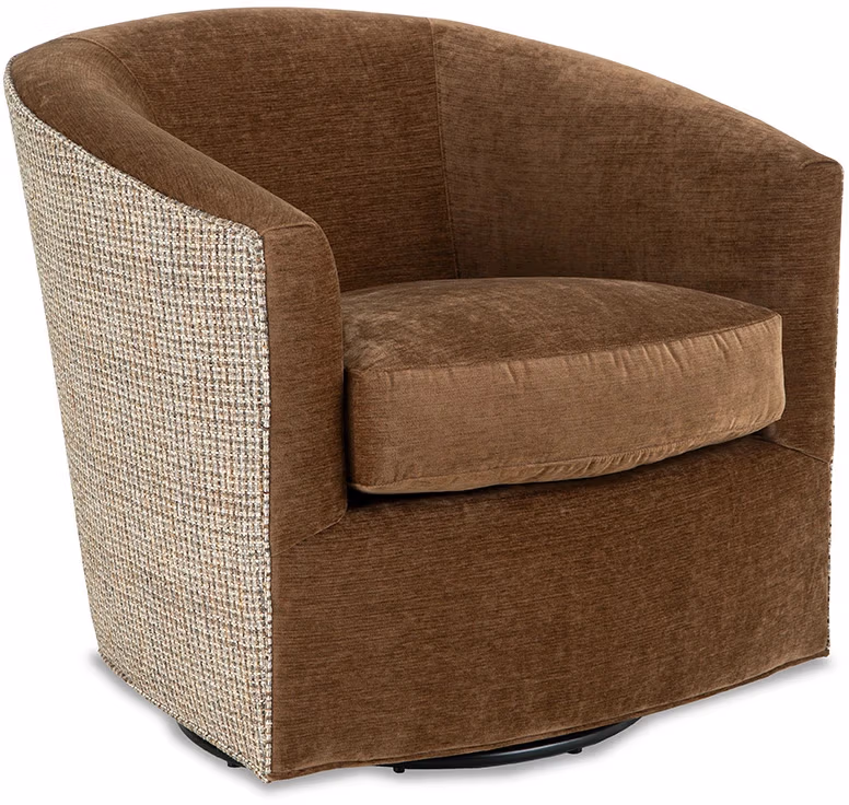 Meet Posh…A modern barrel silhouette that has shape in the front. Cocooning shape designed for comfort and conversation. Compact scale that works well as an accent or in pairs. Plush blend down seating and ability to contrast the outside makes this one a must. Also available as a swivel 059810BDSC.