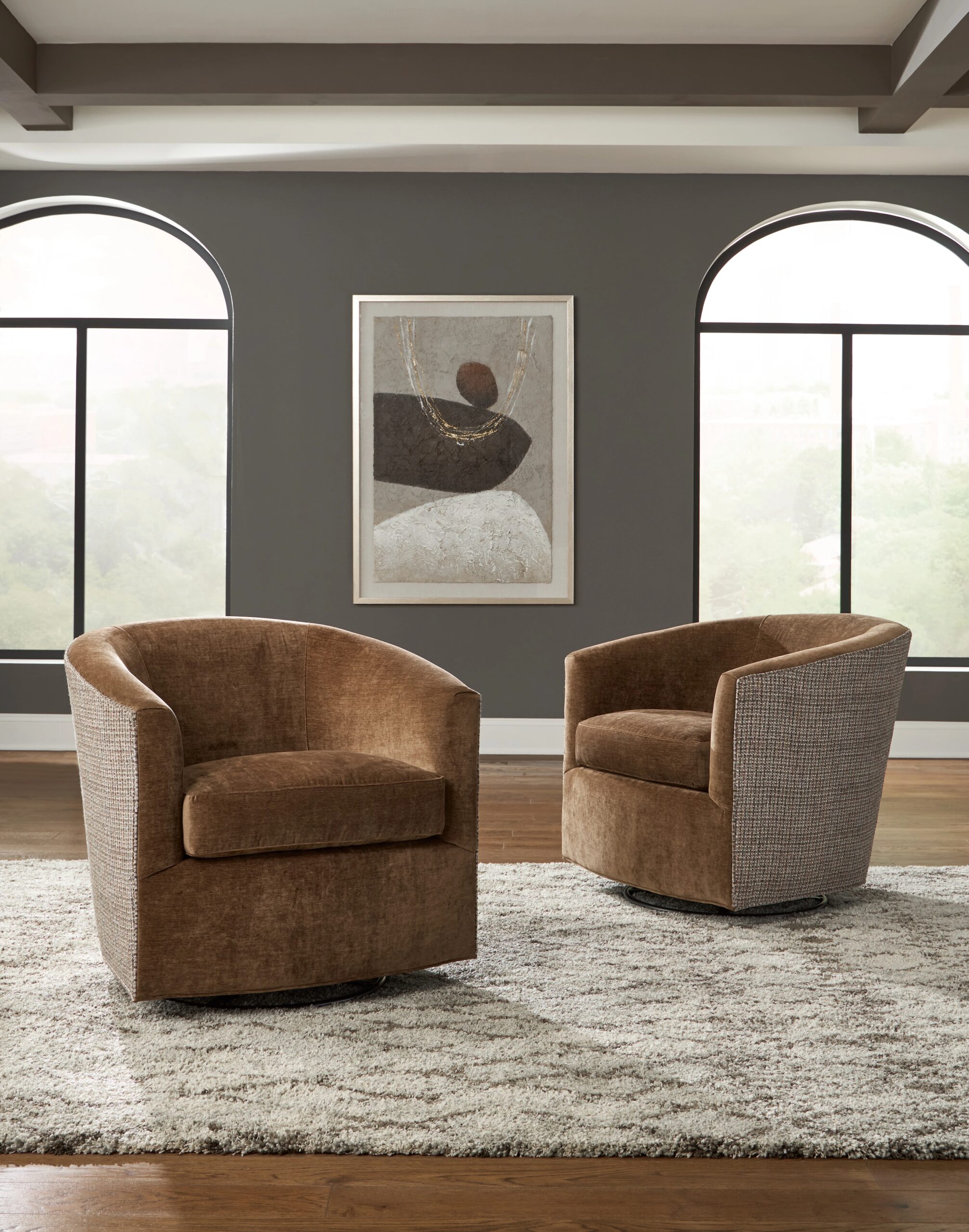 Meet Posh…A modern barrel silhouette that has shape in the front. Cocooning shape designed for comfort and conversation. Compact scale that works well as an accent or in pairs. Plush blend down seating and ability to contrast the outside makes this one a must. Also available as a swivel glider 059710BDSG.