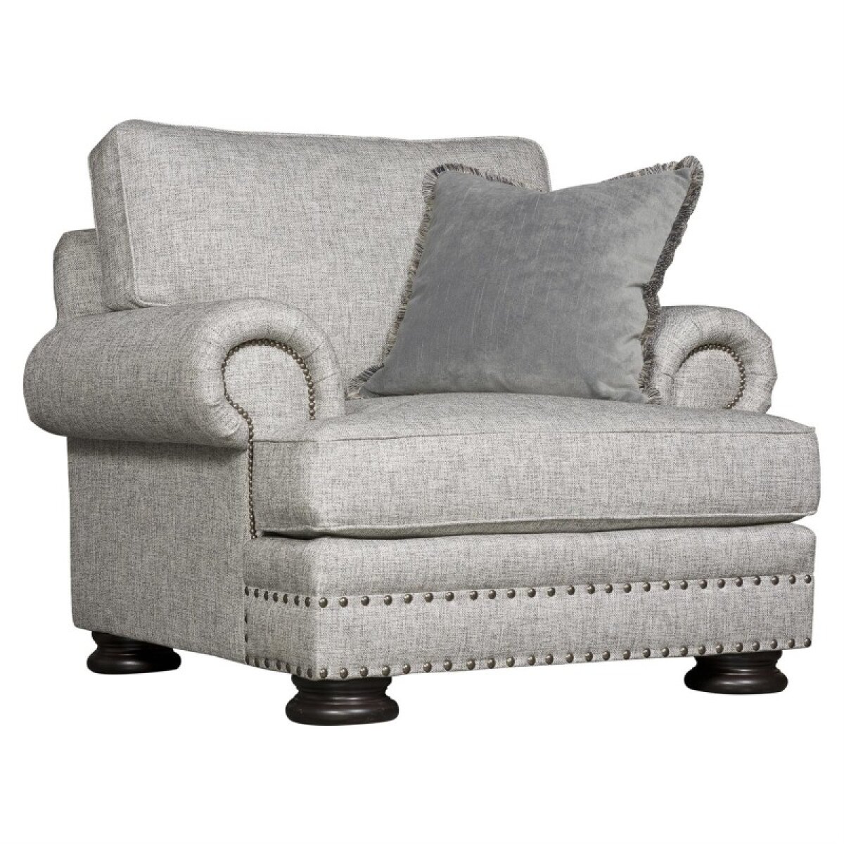 Enjoy the rich look of our Foster furniture line in a convenient chair size. This collection projects a feeling of grandeur in a comfort that will have you feeling right at home. The padded frame and thick seat and back cushions provide relaxed seating. Wide legs add a luxurious final touch. Pair this chair with a Foster Ottoman to extend the comfort further.