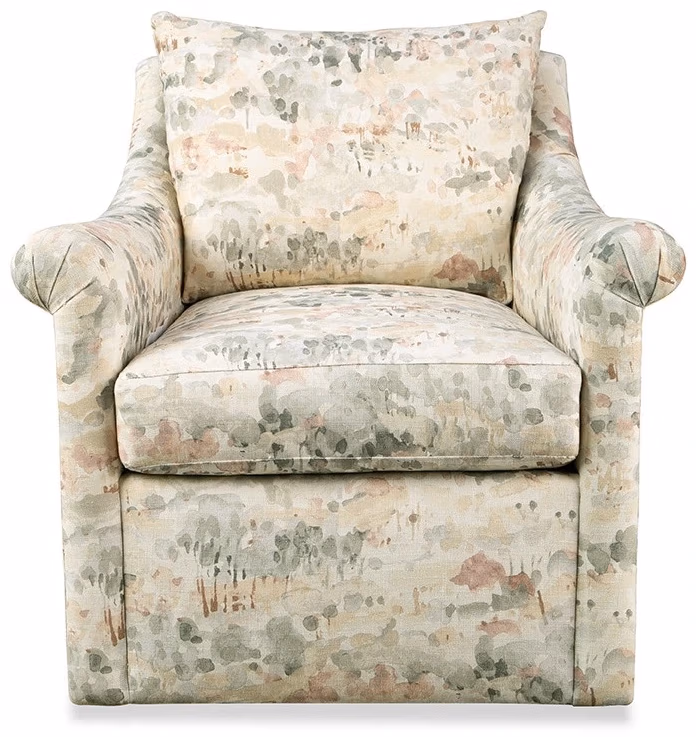 Understated and elegant, this swivel chair is beauty defined. It features slender sloping arms that taper from back to front and is finished with a pleated detail on the face. French seamed overall with a knife-edge bed-pillow style back pillow. Blend Down seat cushion.