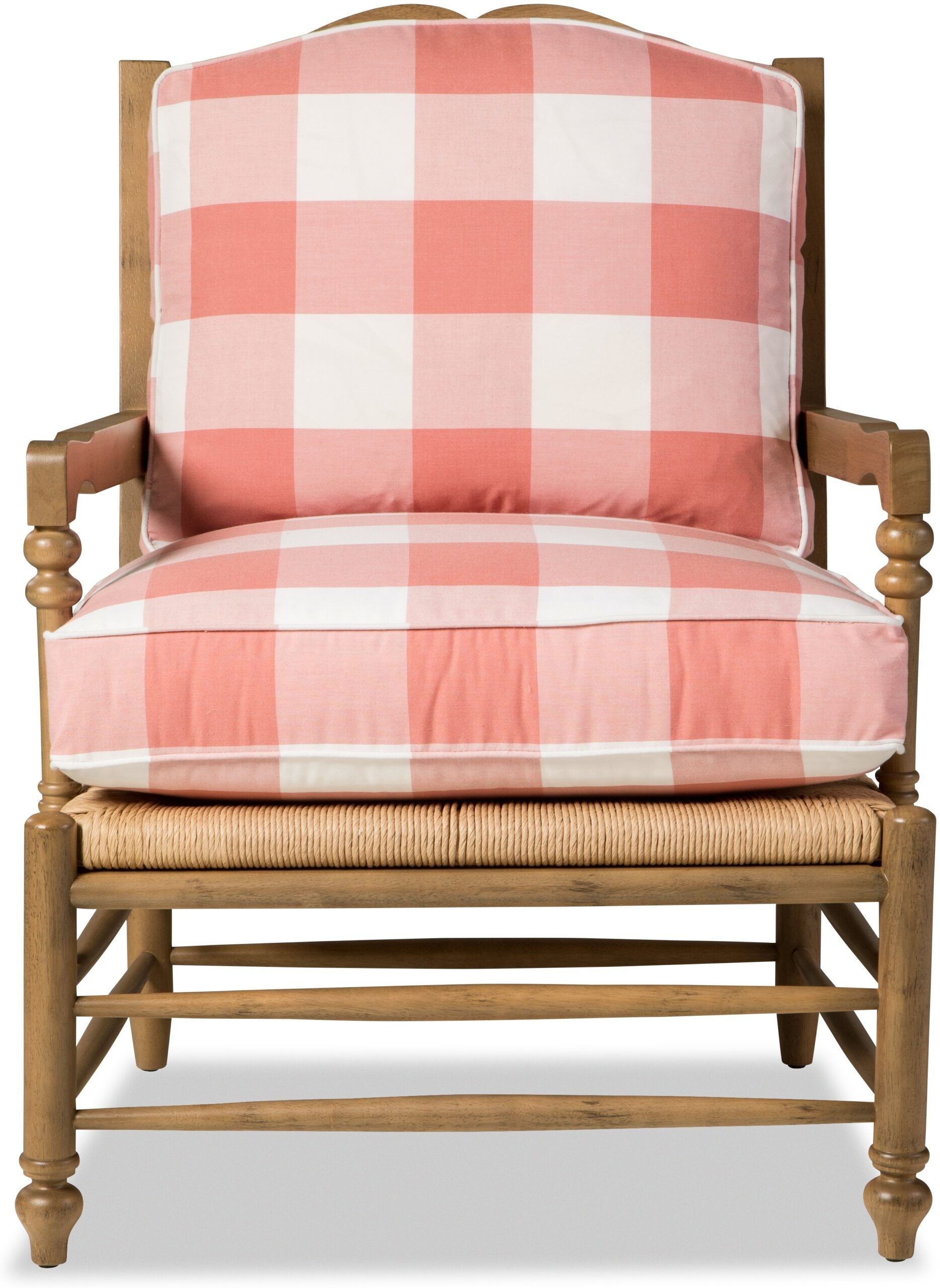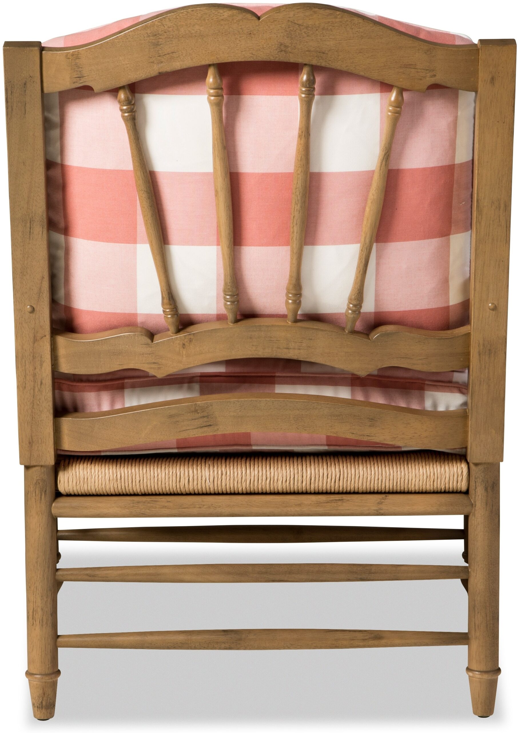 Make this unique wood accent chair and ottoman the centerpiece of your room and wait for the compliments! Part of the Paula Deen Home collection, it features Paula’s exclusive down blend seat cushion for a premium level of comfort. Beautiful turnings on the legs, arms and especially the back, as well as a sweetheart-shaped top rail, make this a one-of-a-kind showstopper you’ll enjoy for years to come. The seat base is woven with natural rush, giving a lovely hand crafted quality.