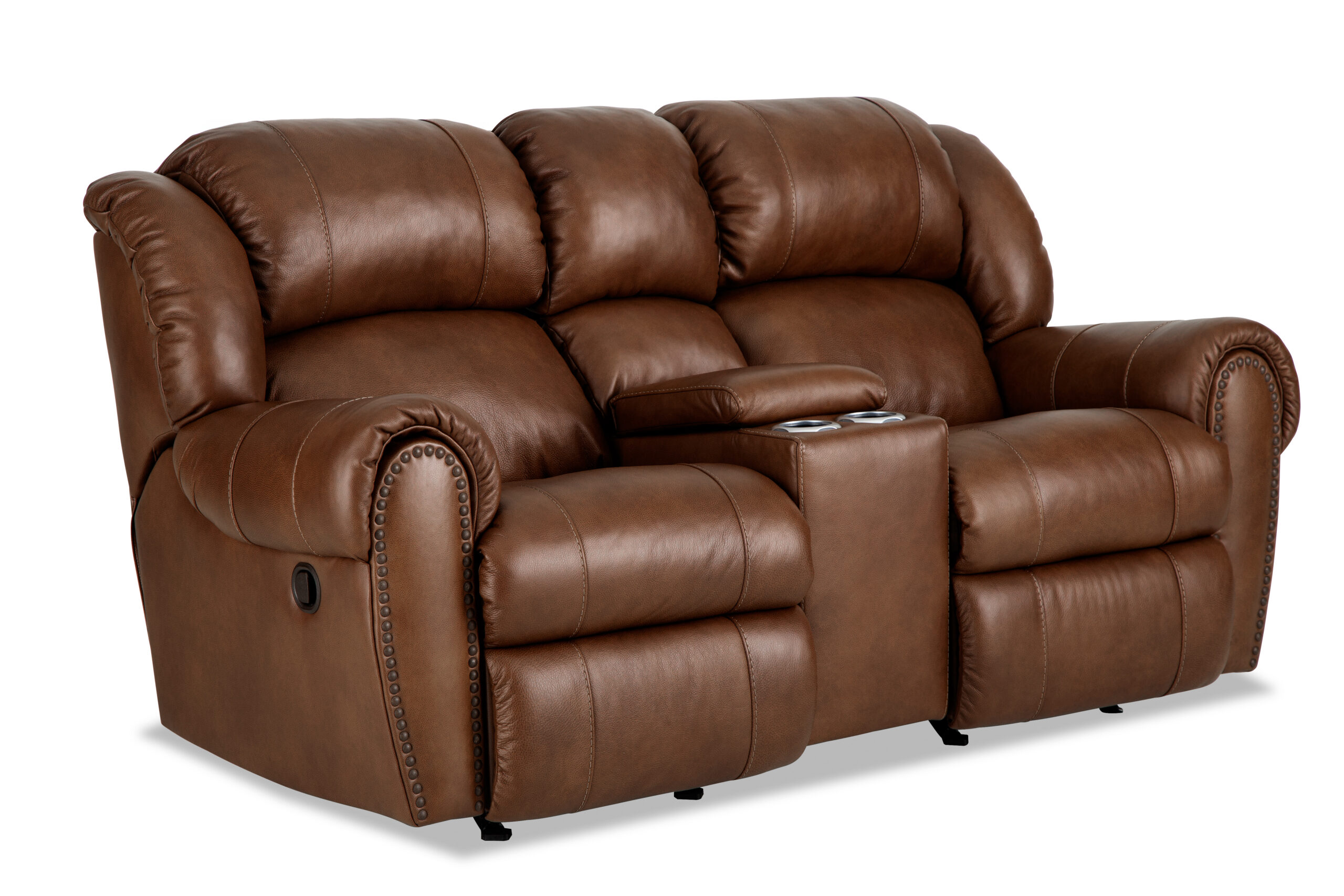Power Console LoveseatTop-grain cowhide leather coverDouble-needle accent stitchingNailhead trim on armsPlush, pad-over chaise leg support