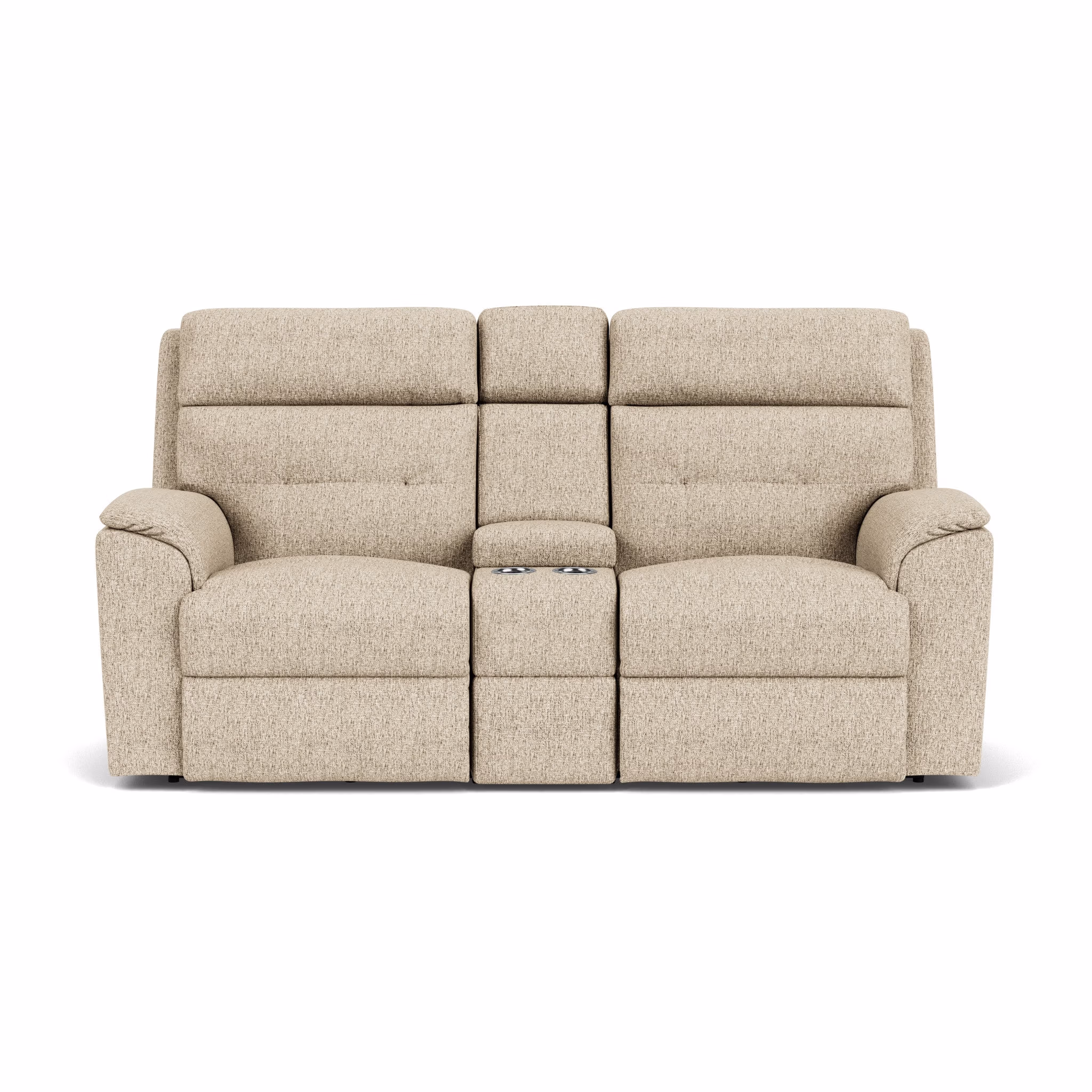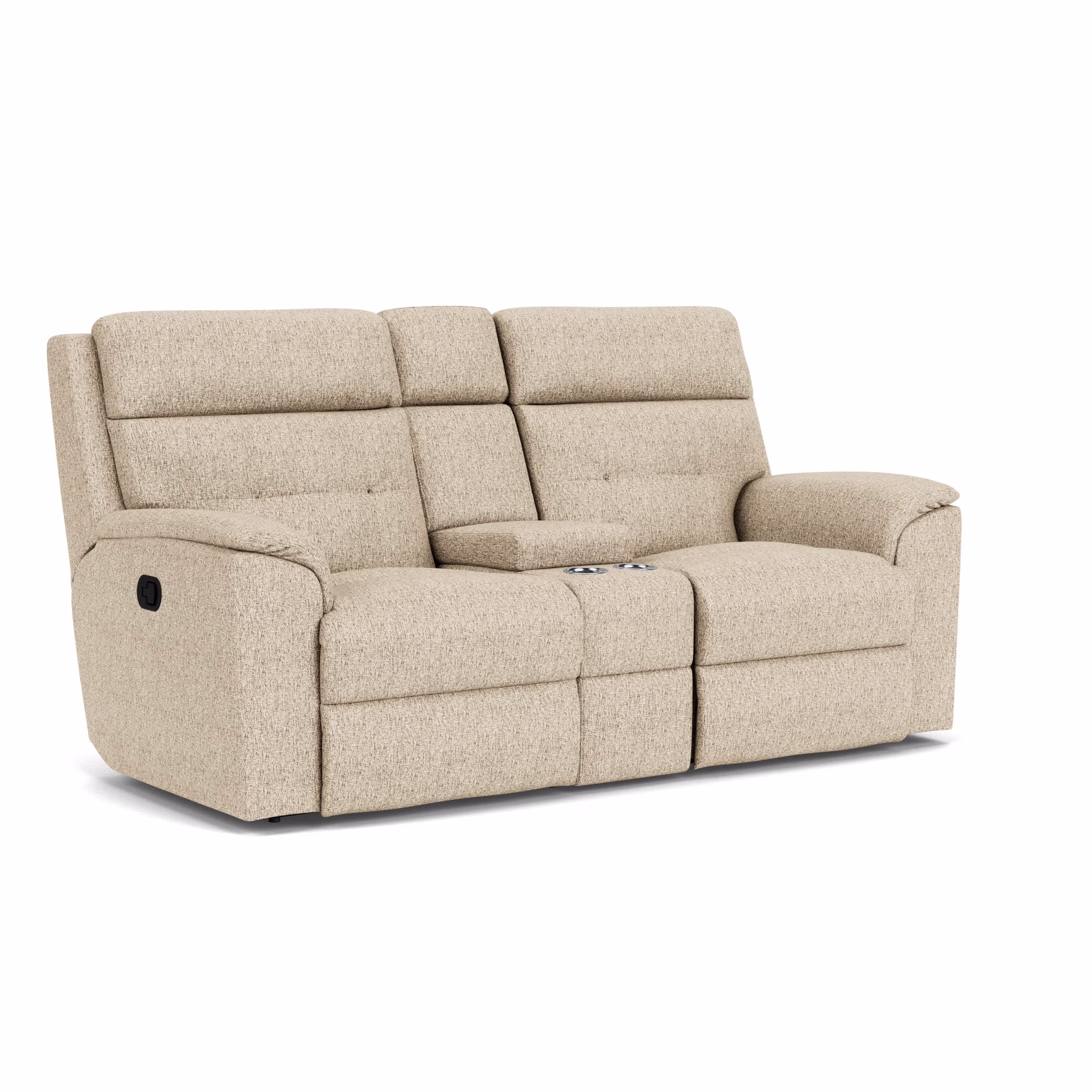 Get cozy in seating built for two with the Mason Reclining Loveseat with Console. A convenient center console gives you plenty of space to keep beverages close by and store remotes, magazines, eyeglasses and more. Adjust the recline with a handle-activated system accessible on both arms. Pad-over armrests provide generous forearm support, while high-divide back cushions take pressure off your head, neck and shoulders. Additional tufting takes pressure off your lower back. Our patented DualFlex Spring System™ bolsters the frame and ensures firmness and flexibility every time you sit, making Mason ideal for active and energetic families.