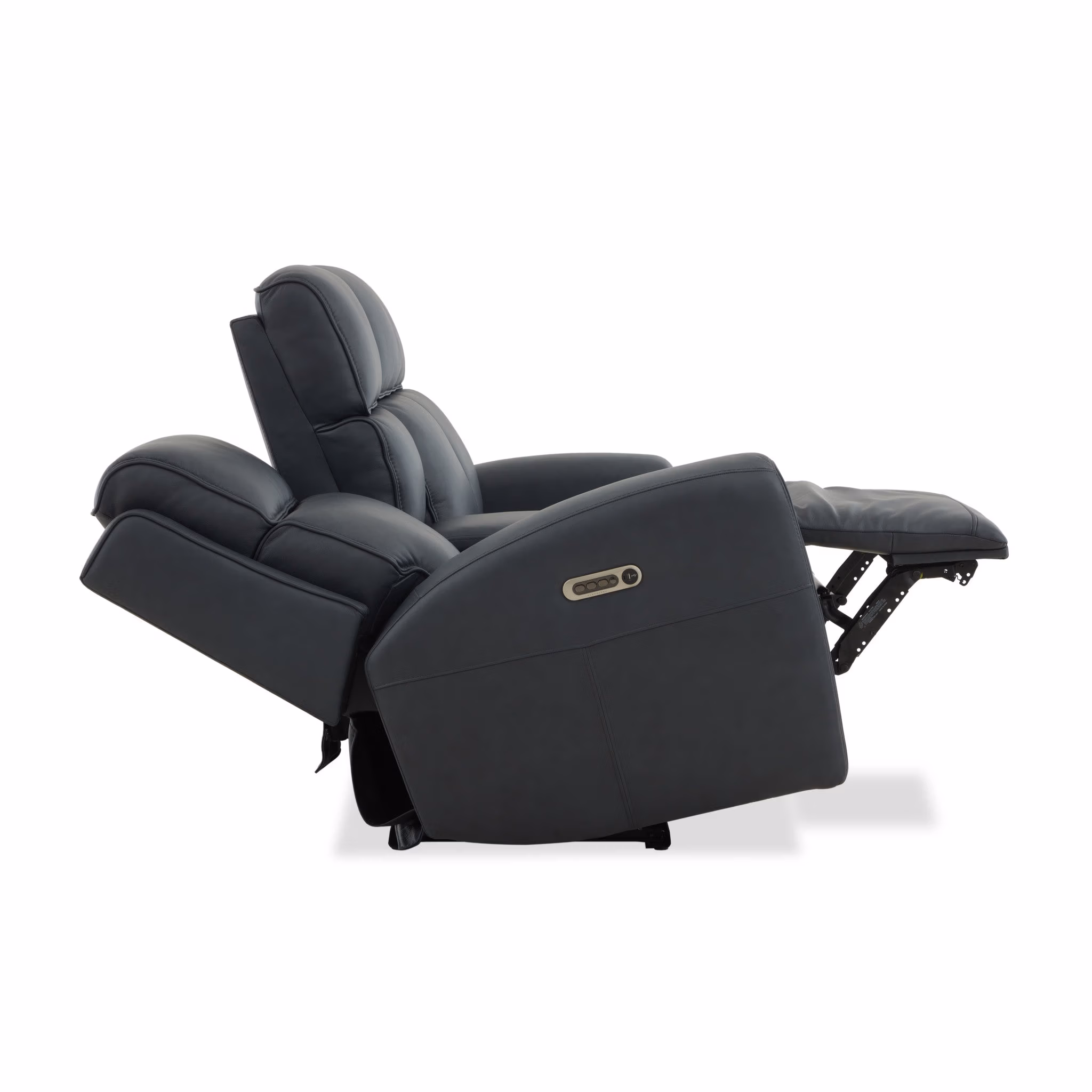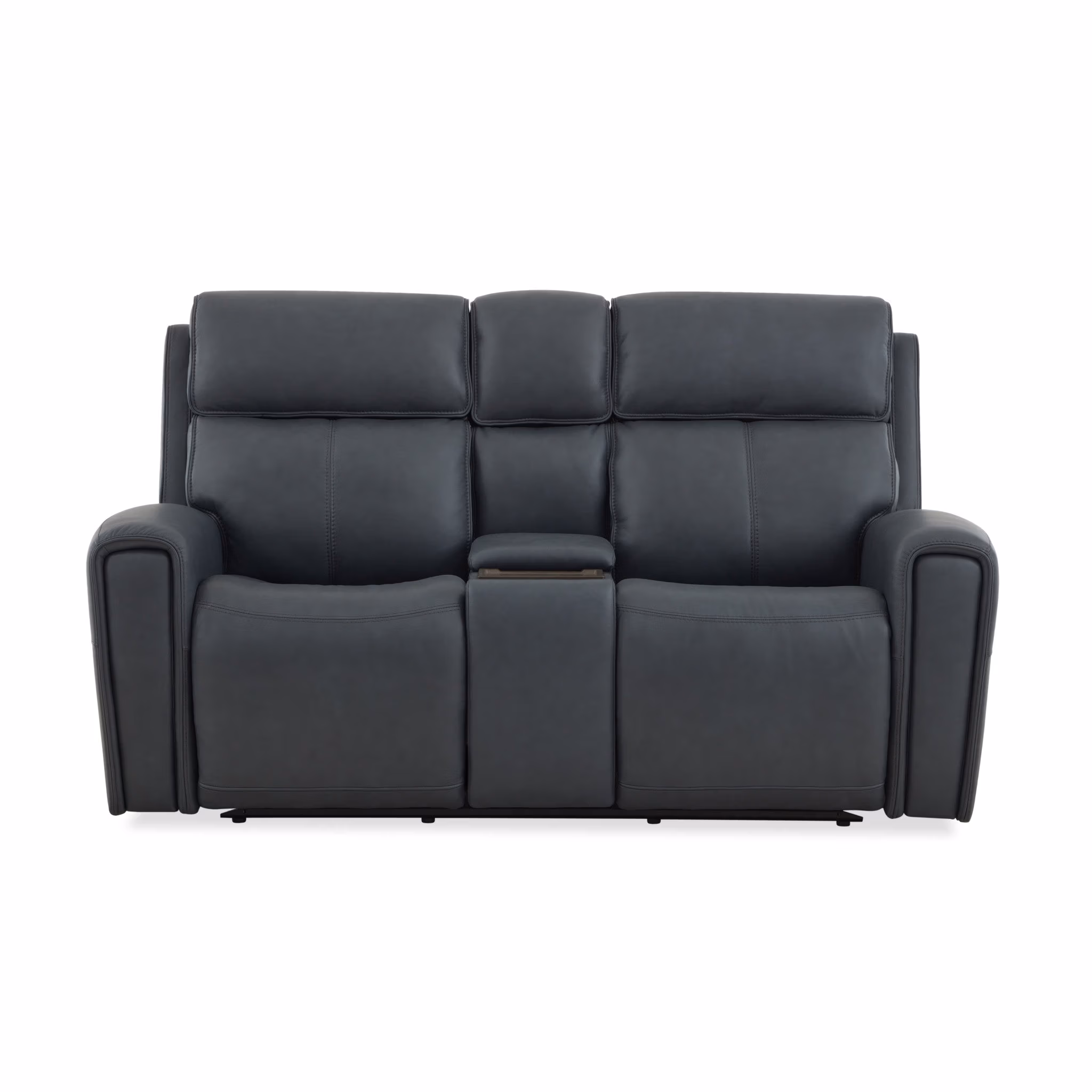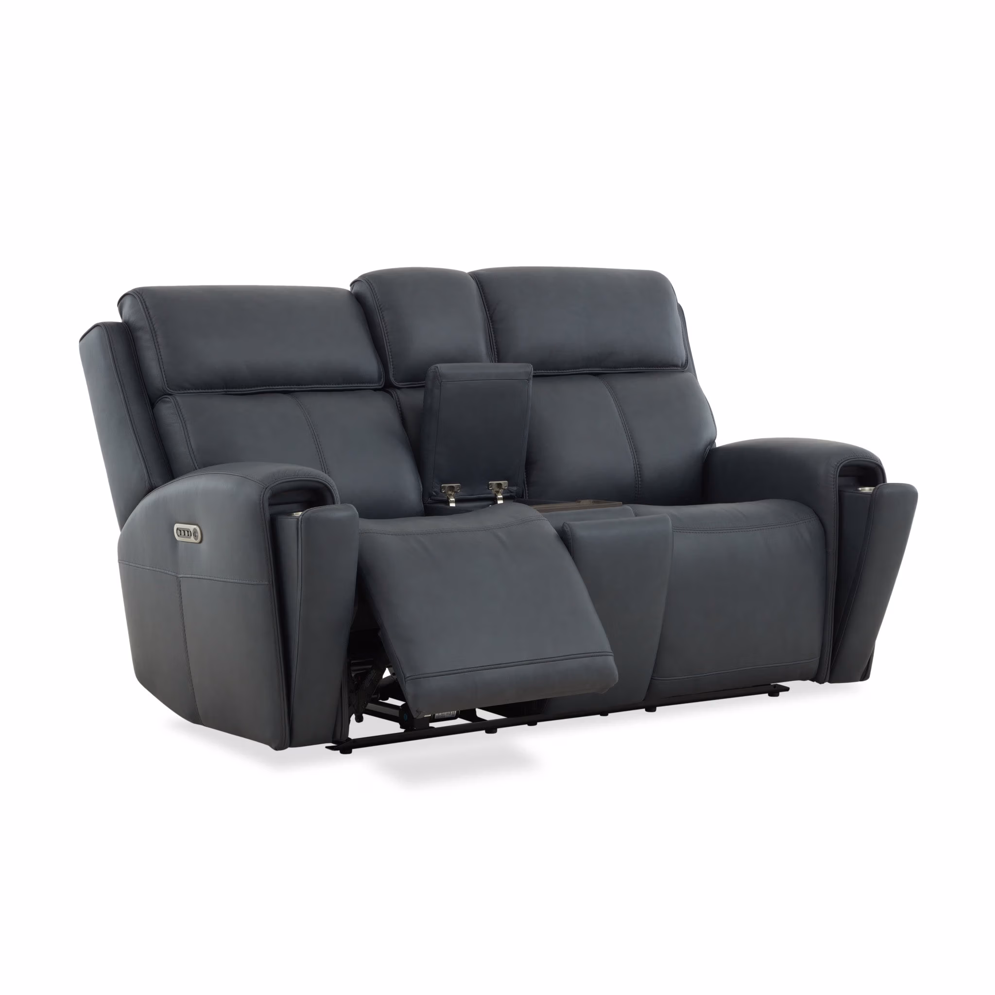 The Warren power reclining loveseat with console is designed for relaxed, side-by-side comfort, pairing intuitive motion with convenient shared features. Power reclining with adjustable headrest and lumbar allows each seat to be personalized, while the high back, to the floor silhouette and waterfall chaise provide continuous support. A center console with concealed cup holders and integrated charging keeps essentials within reach, making this loveseat ideal for everyday lounging or casual evenings at home. Upholstered in protected leather, it offers soft comfort with a tailored finish built for daily use.