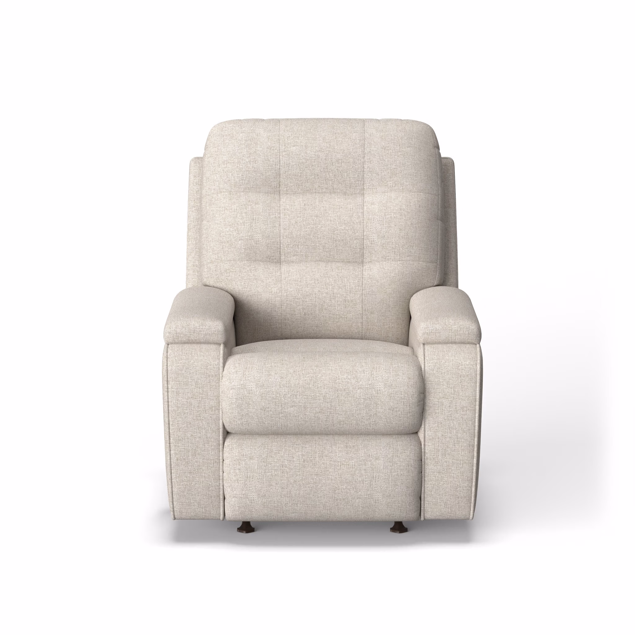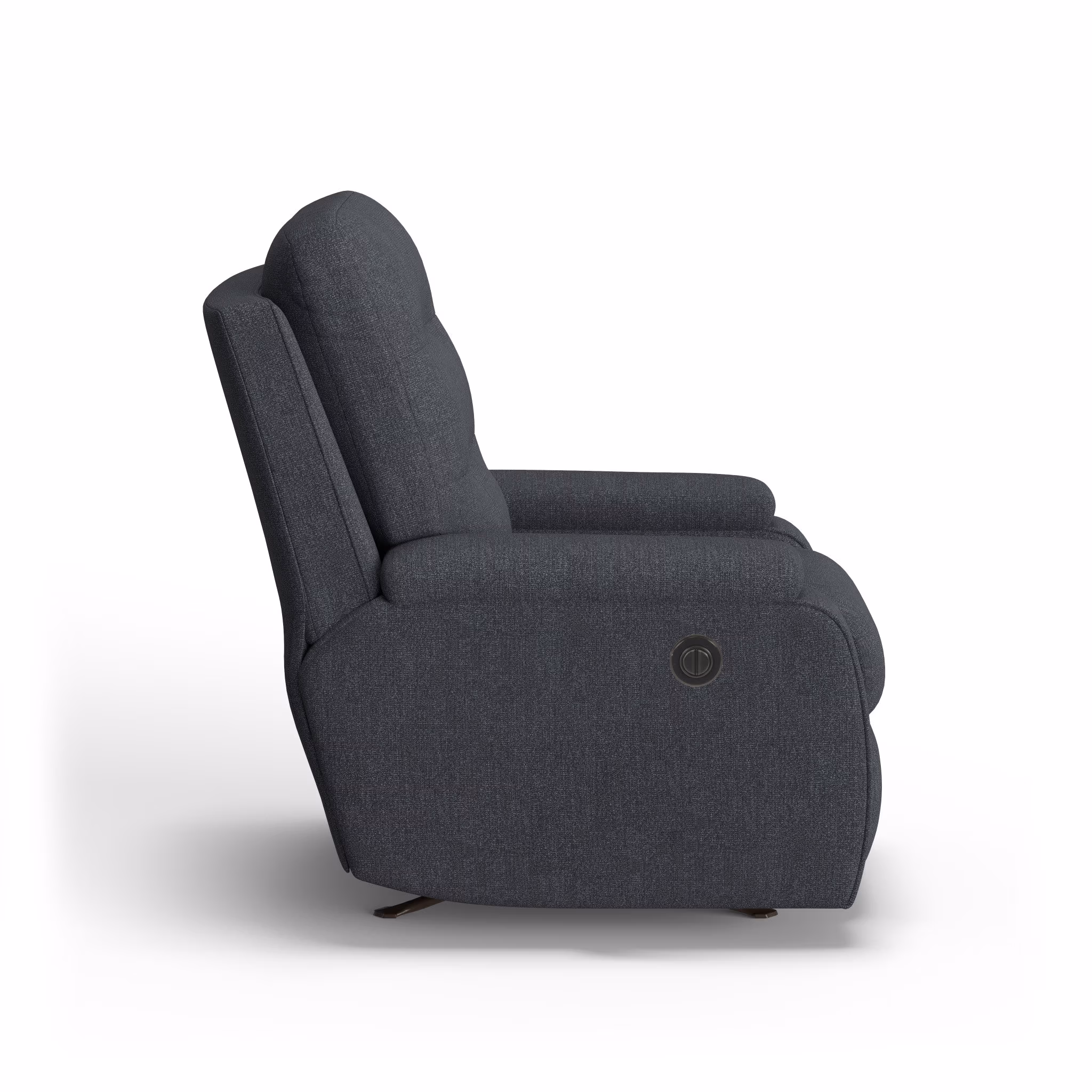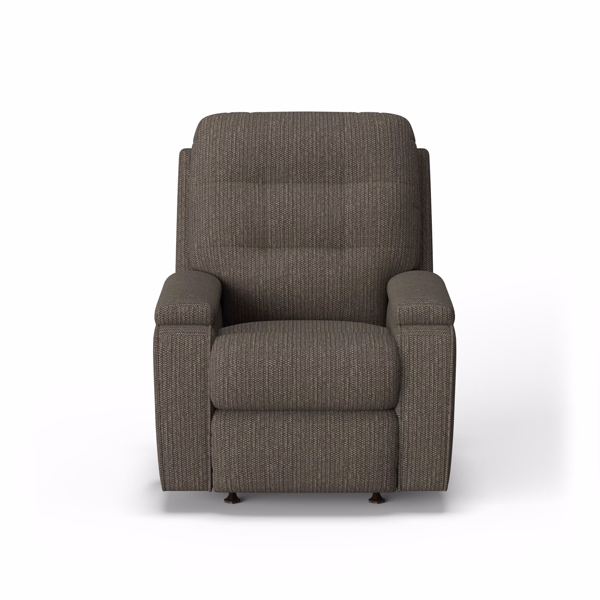 Kerrie should rest on a runway. It exudes the comfort, styling, and scale fitting of first-class seating on any airline. The recessed pad on the curved arm, the fully padded footrest, and the tufted back give Kerrie its superior comfort, support, and contemporary flair. A power rocking reclining mechanism lets you rock and change angles effortlessly from an upright to a fully reclined position with the touch of a button.