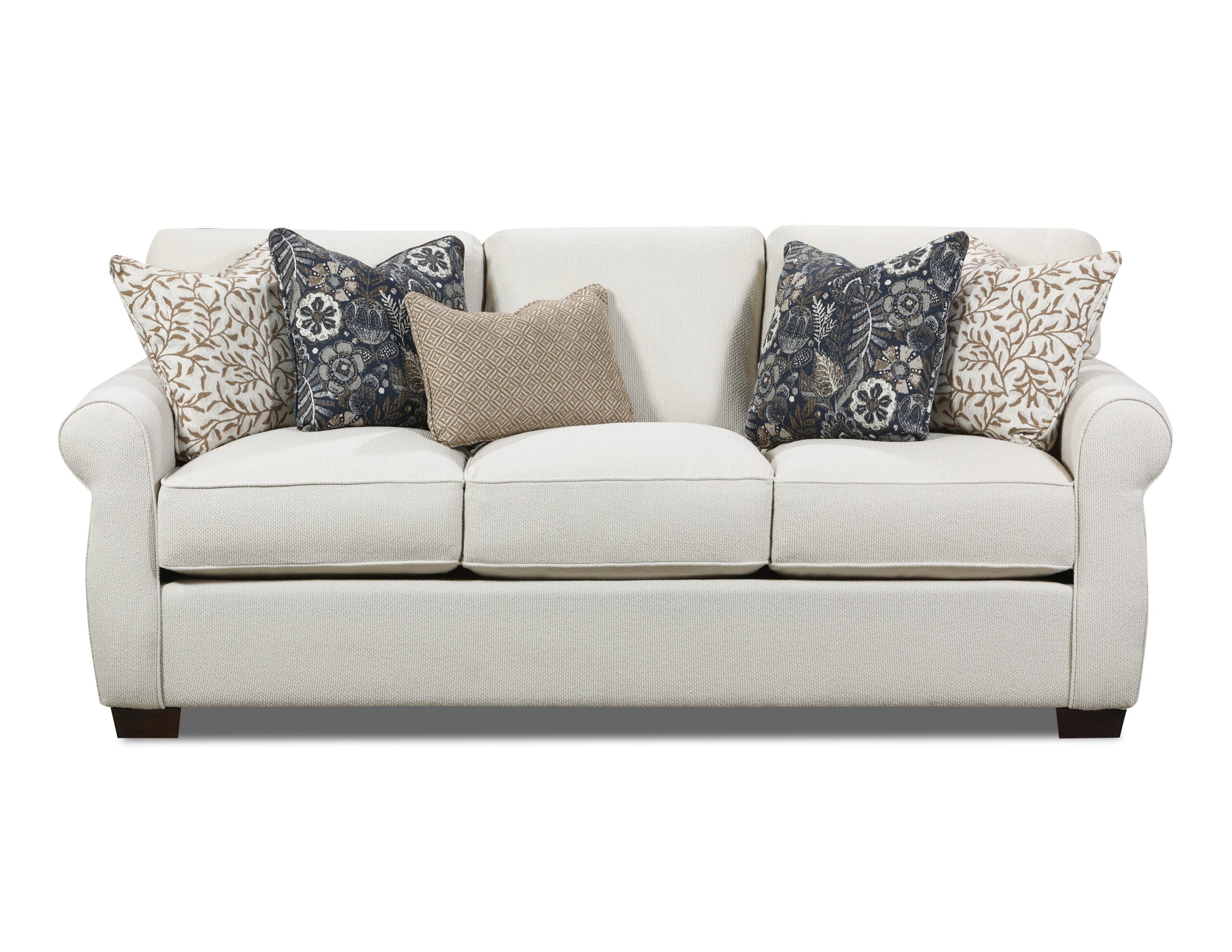 This collection showcases a clean, creamy neutral fabric with a subtle, textured weave for added elegance. The cushion arrangement features an inviting mix of earthy tones, combining botanical prints, geometric patterns, and deep navy floral designs. These accent pillows introduce visual interest and contrast, enhancing the warmth and sophistication of the overall look. The fabric combination exudes a refined, nature-inspired aesthetic perfect for transitional or classic interiors.