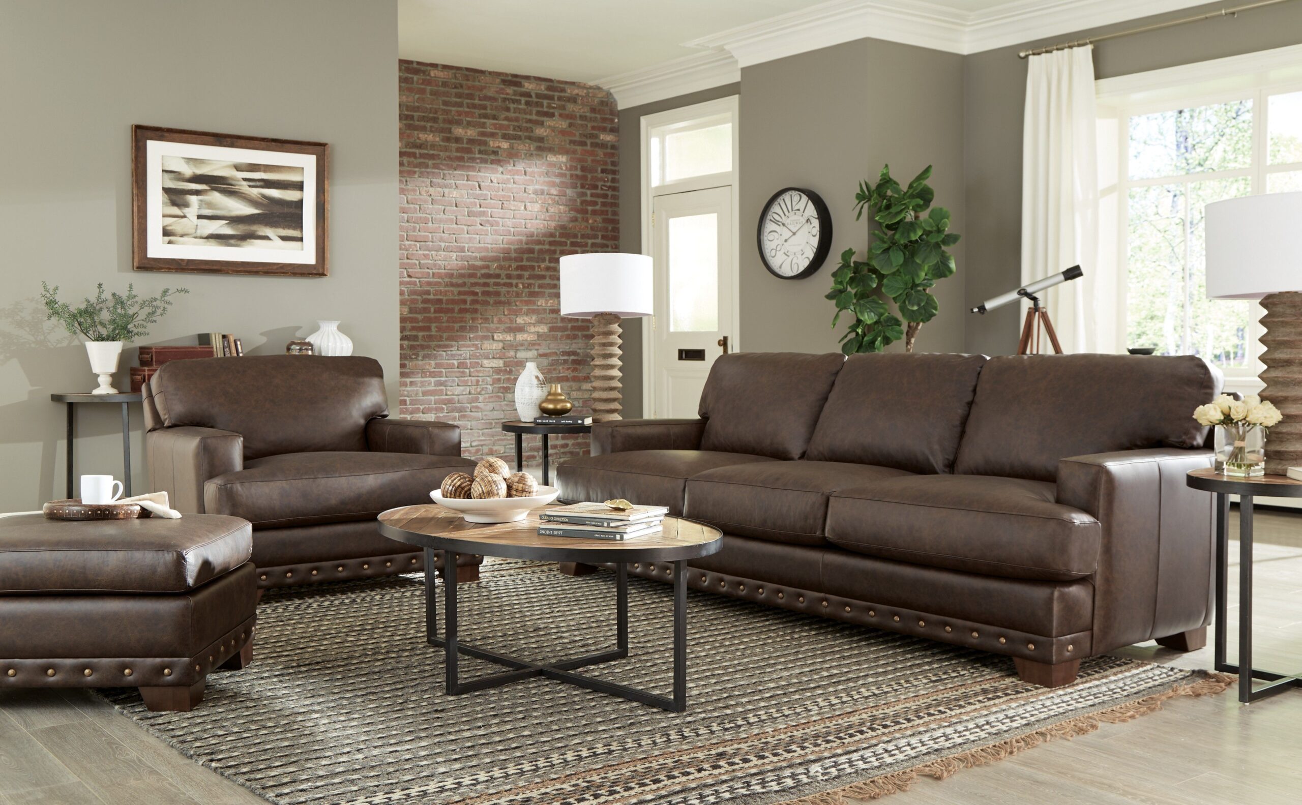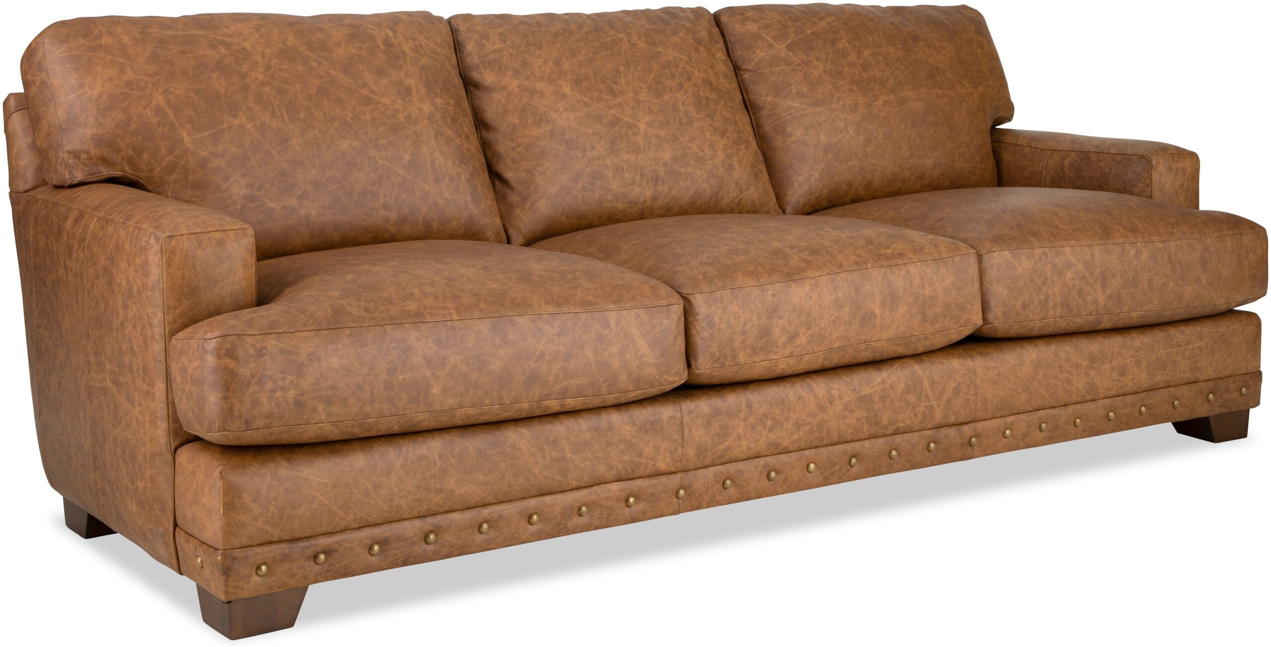 With architectural shaping and bold nail head detailing, this leather sofa has a casual appeal as well as amazing comfort. Deep seated, and generously scaled at 100”, there is plenty of room to relax. It features semi-attached backs, Blend Down Coil cushions, and track arms. Also available are the matching loveseat, chair 1/2 and ottoman. Also available without nail head trim.