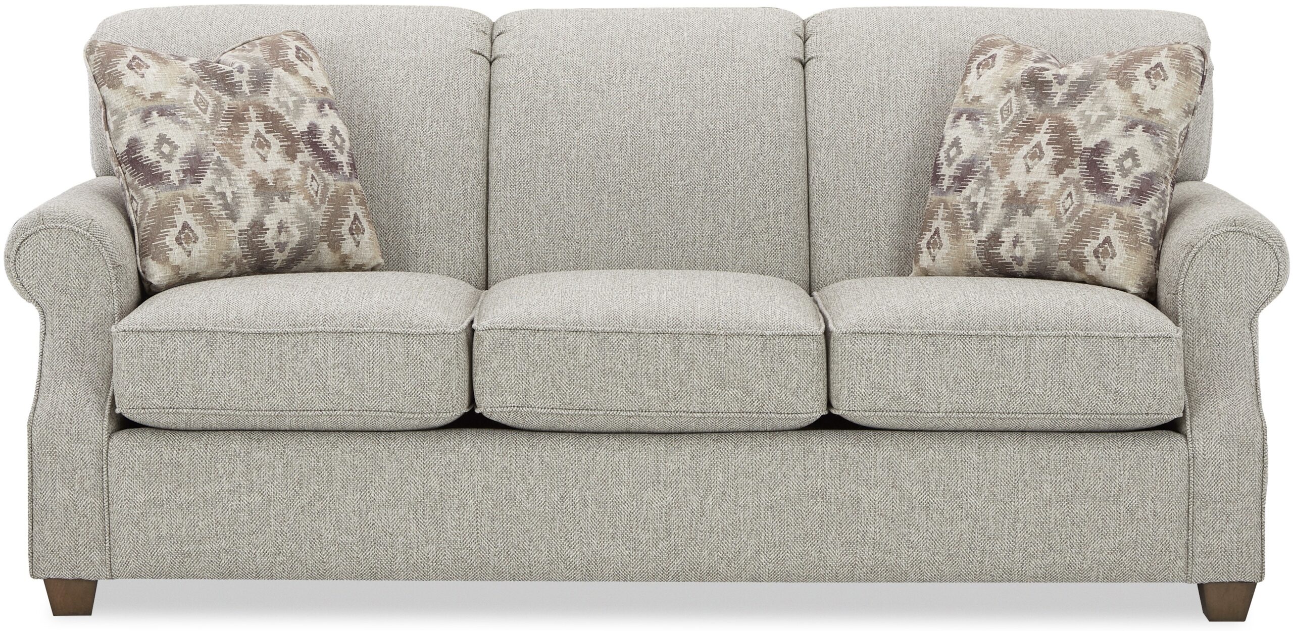 This classic 3 seat style has a plush tight back, rolled paneled arms set back from the front, tapered block legs, and a beautiful, tall rollover back. You’ll find it an easy fit in your casual or traditional living spaces. Matching sleeper, loveseat, chair and ottoman available as well.