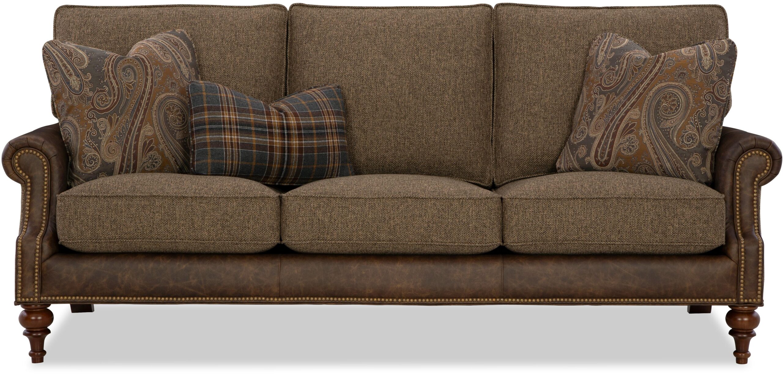 Classic traditional details and nail head trim accents are some of the things you’ll love on this gracefully finessed sofa. Covered in both leather and fabric, it has a unique blended look that can be fully customized with any fabric and leather in our line. (see the Custom Blends order form for details about how to order this). It features a rollover back, cut-back rolled arms, and beautifully turned legs that offer a familiar heirloom touch. Loose box border back pillows and Blend Down Coil seat cushions. Standard with 3 Luxdown toss pillows. Optional nail finishes available. Also available are the matching loveseat, chair 1/2, and ottoman. Also available without nail head trim. To order in all leather, see style L7482. To order in all fabric, see style 7482.