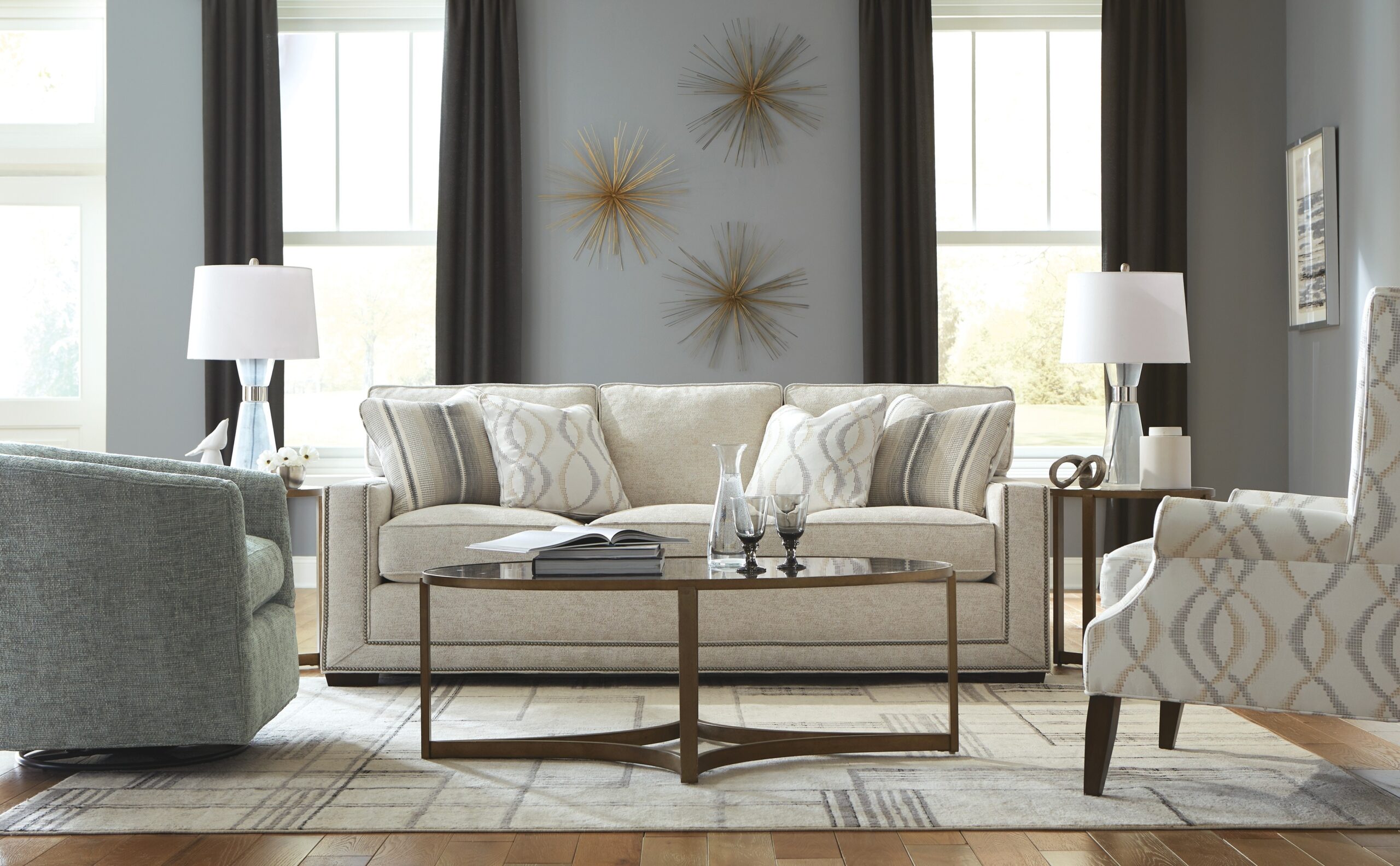Bold and dramatic describe this handsome tailored sofa from the New Traditions collection. It features wide track arms, loose box-border backs, and plush Blend Down seat cushions. The arms and base are elegantly trimmed with double rows of small nail heads to give the effect of a picture frame around this artful piece. Also available are the matching loveseat, stationary chair, swivel chair and ottoman. Also available without nailhead trim.