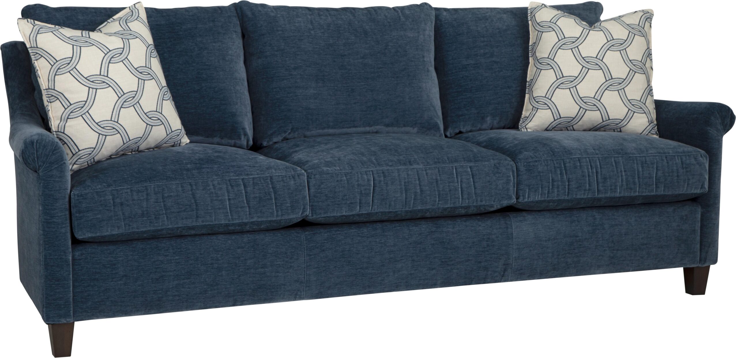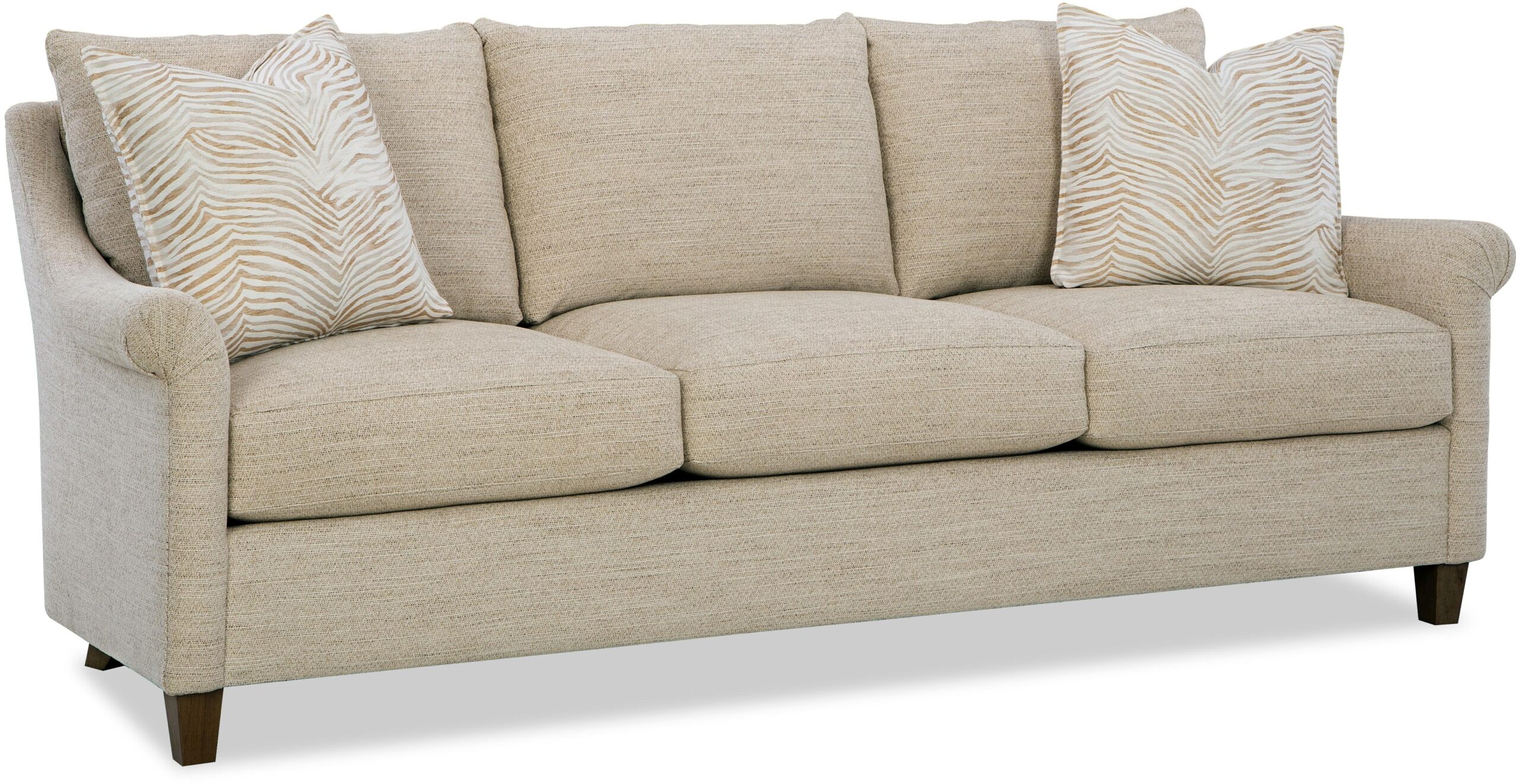 Understated and elegant, this sofa is beauty defined. It features slender sloping arms that taper from back to front and is finished with a pleated detail on the face. French seamed overall with knife-edge bed-pillow style back pillows. Blend Down seat cushion and flanged Blend Down toss pillows. Tapered legs. Also available are the matching loveseat, chair and ottoman.