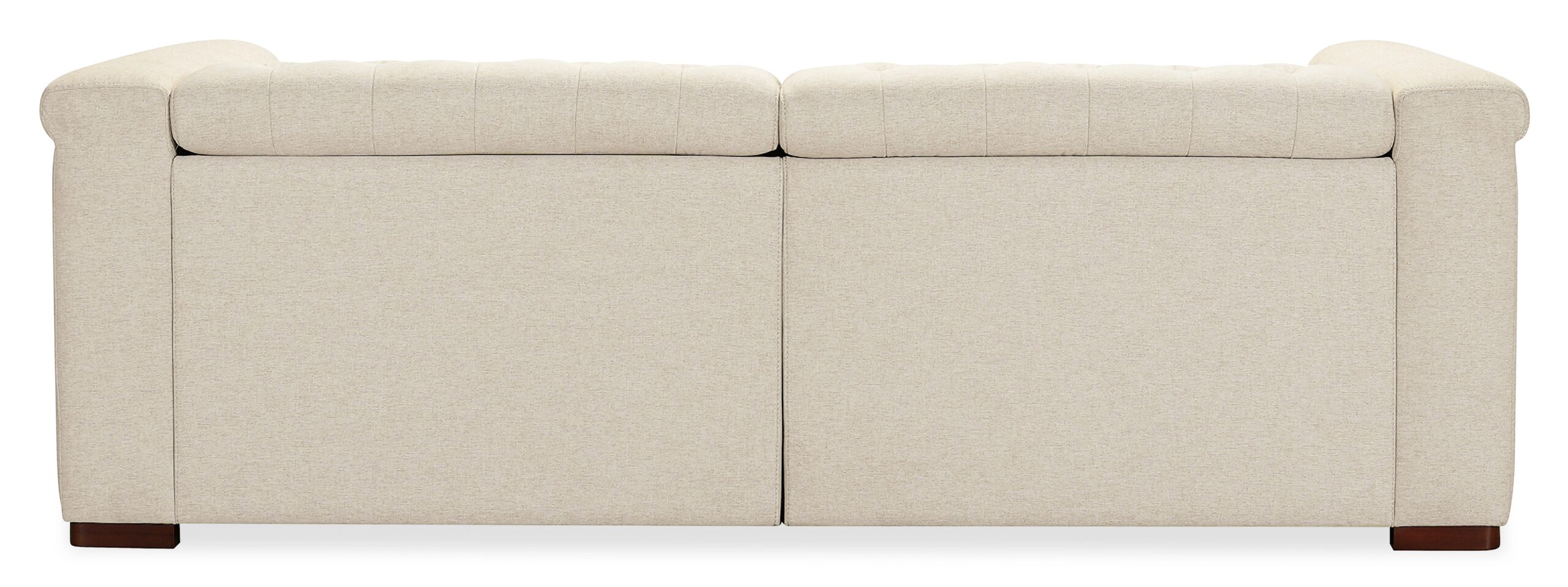 Offering comfort and style, the Savion Deux LAF/RAF 2 over 2 Sofa features power reclining seats at each end and power headrests. Wrapped in Aries Beach performance fabric, this two-cushion sofa blends classic chesterfield tufting with copper-toned nail trim and a dark wood finish. The smooth, variegated sand-colored polyester fabric provides durability and comfort. With high-density foam cushions and a discreet power recline function, this sofa delivers both elegance and convenience for your living space.