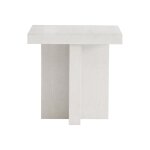 A square top in a sandblasted white finish is supported by two intersecting legs on the Blythe side table. The geometric design and dimensional effect give this modern rustic table a standout style.