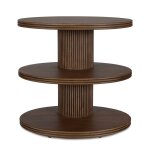 Handcrafted from mindi wood with a rich dark walnut finish, this distinctive side table features three oval tiers connected by elegantly fluted columns.