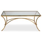 Gracefully arched hand forged metal finished in sleek satin black. Top is clear beveled tempered glass.