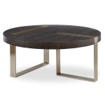 Sleek and modern, this coffee table showcases linear steel accents plated in a brushed pewter accented by a dry ebony finished oak veneer top with wire brushed details that enhance the natural wood grain.