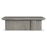 The Monolith cocktail table perfectly balances curves and lines with softly rounded corners on the top and the plinth base. A unique panel extends from the base, offering bold detail. Deep wirebrushing creates beautiful texture in the Puma finish.