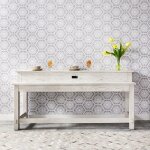 This Modern Farmhouse console bar table is crafted from poplar solids with knotty white oak veneers and a flea market white finish. It features a planked top, two plug receptacles, and USB ports for convenient charging, with space for three barstools.