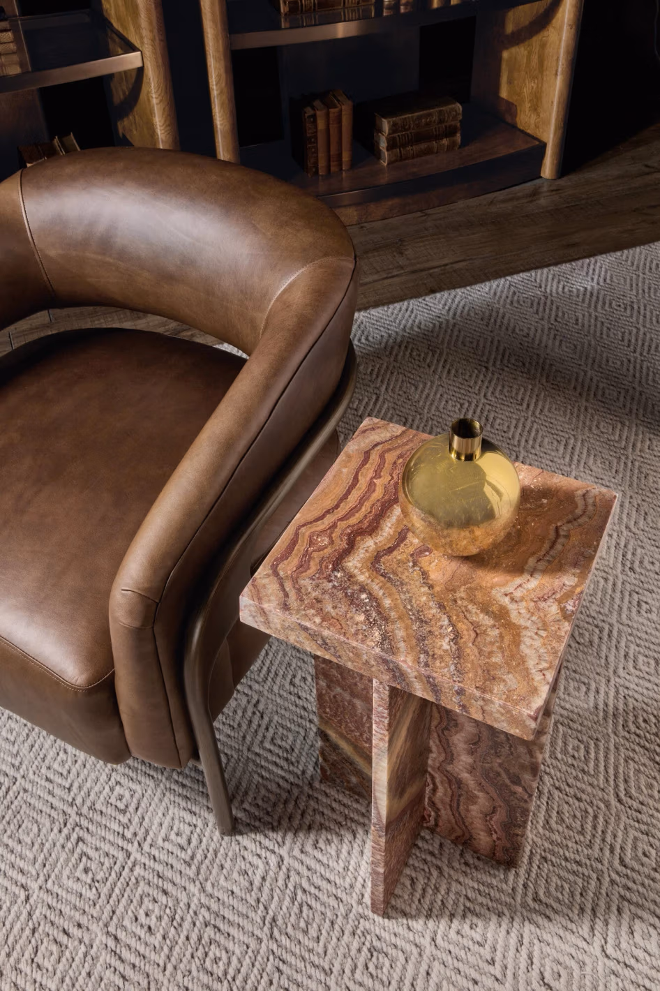 Sculptural spot table crafted of red travertine with an X-shaped pedestal and square top. A compact stone drink table that brings bold, luxe presence to small spaces.